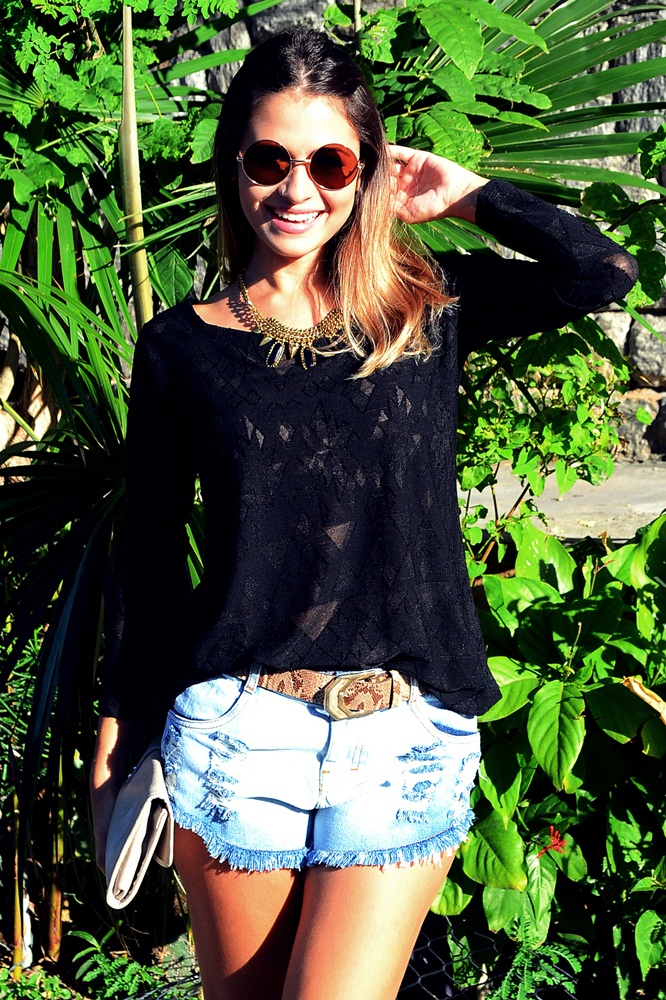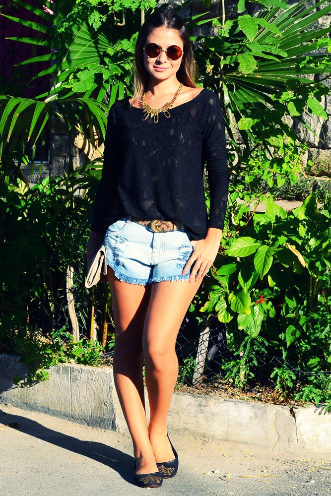 Estou completamente apaixonada por esse short. Detonado, folgado e estilosinho. ADORO! A blusa preta fechou mais a produção, e tentou deixá-la menos noturna, mas não sei se obteve êxito, haha. E aí, só joguei os acessórios que deixam tudo menos básico… Cinto, colar, óculos, clutch. E nos pés, a boa e nova sapatilha. Mais uma que vocês vão ver demais por aqui, garanto! E aí, gostaram? Usariam? Me contem tudo!