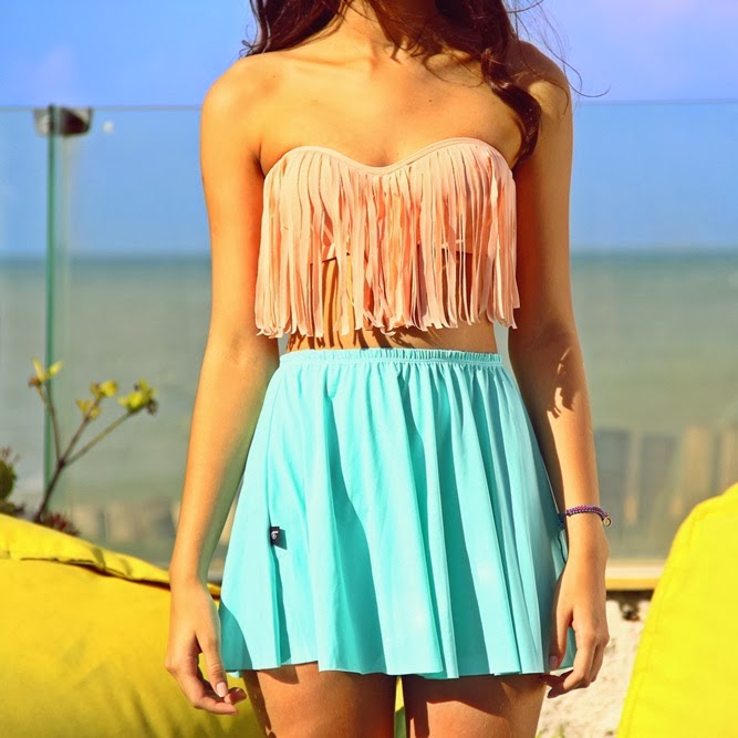 Top de franjas pêssego + Saia godê turquesa + Calcinha básica Abacaxi Verde